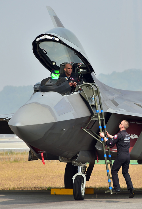10月19日,在韩国城南市,美国飞行表演队人员检查参展的F-22战斗机。