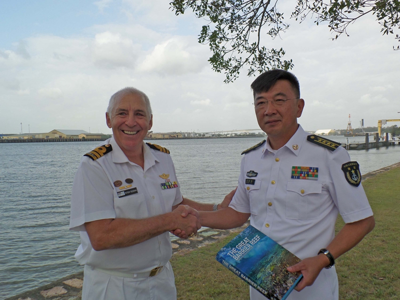 10月8日,南昆士兰州海军司令部司令塔德曼(左)向“和谐使命-2015”任务指挥员管柏林赠送画册。