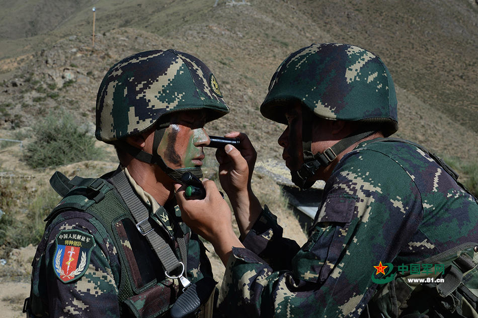 特战队员在进行迷彩化装
