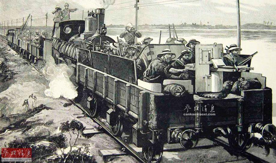 图为1882年在埃及作战的英军装甲列车,配有1门诺登飞多管排列机枪。