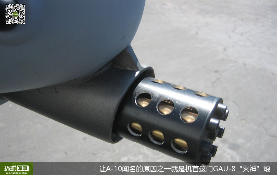 A-10攻击机的前机身内左下侧安装了1门30mm的GAU-8型7管加特林式机炮,机炮安装的下俯角为2°。最大备弹量1350发。整个机炮系统重约1.8吨。主要用于攻击地面上的装甲目标。