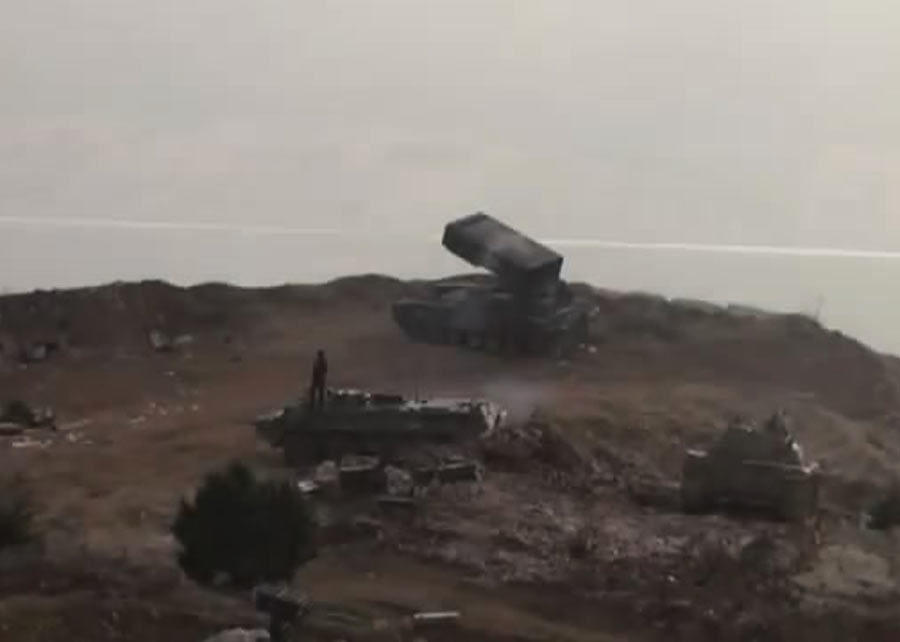 10月23日,叙利亚电视台新闻节目中出现政府军使用俄罗斯TOS-1“日炙”喷火坦克,炮击东北部山区拉塔基亚的叛军阵地镜头。TOS-1装备有BM-1发射系统,可以发射24枚弹药。叙利亚军队的TOS-1使用早期T-72底盘进行改装。TOS-1A喷火坦克被设计为火力支援步兵和坦克,击败敌方人员,在各种攻防实战对开放式和封闭式射击阵地,以及对轻型装甲车和车辆进行打击。通过射出弹幕对目标进行火力打击,由此达到对打击目标的火力覆盖。