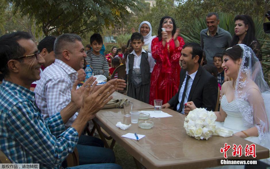 当地时间10月23日,叙利亚科巴尼一对新人正在举行婚礼。婚礼现场布置的十分简单,夫妻二人沿途走过的街头废墟和大炮随处可见。新郎新娘在户外举办了酒席,亲朋好友相聚。这对科巴尼库尔德夫妻是自从科巴尼从“伊斯兰国”手中夺回后第一对举行婚礼的夫妻。
