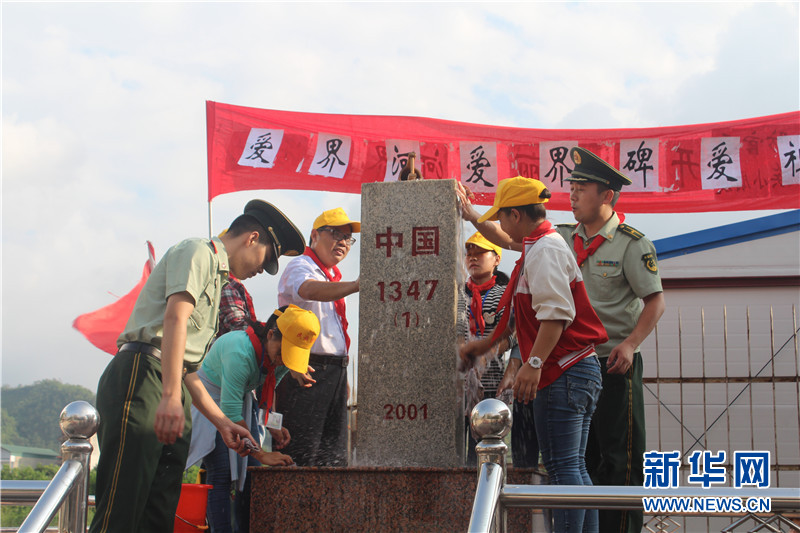 边防官兵和师生代表擦洗界碑