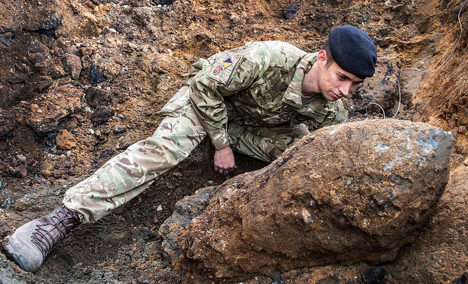 皇家后勤兵团拆弹专家理查德·麦金农(Richard McKinnon)检查二战时期的德军炸弹。(网页截图)