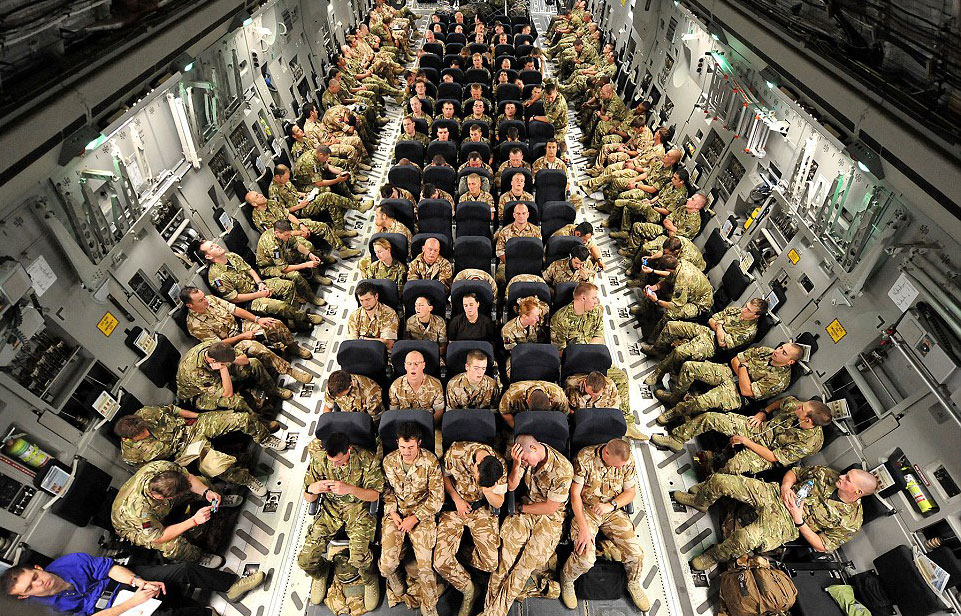 这张照片中,在第16空中突击大队中服役的国防部士兵乘坐皇家空军C17运输机前往阿富汗服役。(网页截图)