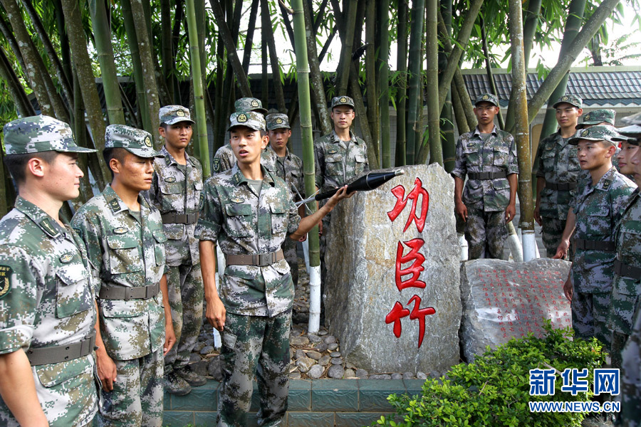 广西军区某边防团十连官兵在“功臣竹”前讲述连队历史。刘金鹏 摄