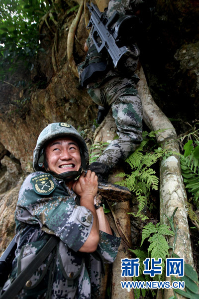 广西军区某边防团十连官兵们齐心协力爬高山。郑希胜 摄