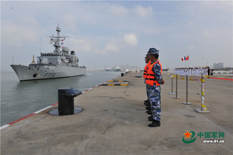 中国军网湛江10月27日电特约记者高毅、通讯员唐若膑摄影报道:10月27日上午,法国海军“葡月”号导弹护卫舰,在我海军导弹护卫舰运城舰的伴随引导下,缓缓驶入广东湛江某军港,开始对南海舰队进行为期4天的友好访问。南海舰队在军港码头举行欢迎仪式,湛江市相关领导以及法国驻华使馆人员出席欢迎仪式。