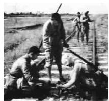 ■ 曾尝过地雷战厉害的日本老兵斋藤邦雄用一幅漫画描述当年的情景,漫画中的日语意思是:“整天翻山头,真是累死半条命啊。”“有人踩地雷啦!”“卫生兵,快来呀!”