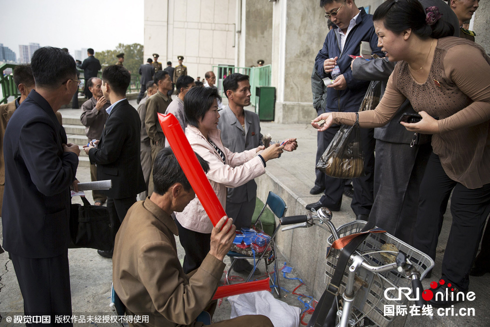 当地时间2015年10月8日,朝鲜平壤,足球赛之前,人们以黑市汇率用朝鲜圆和美元购买充气拍板。图片来源:Reuters/视觉中国