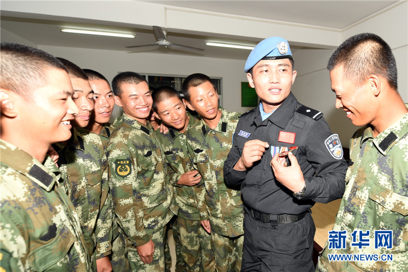 维和警察防暴队队员张东旭向新兵讲述维和事迹