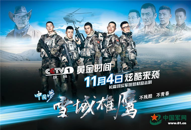 长篇现实军旅题材励志剧《雪域雄鹰》央视一套(CCTV-1)黄金档炫酷开播。《雪域雄鹰》以新时代“中国梦”“强军梦”“90后偶像正能量”“首部聚焦极地军旅”“热血青春、极地军旅”等标语精确阐述了真实反映我国当代军人风貌的影视作品的精神高度和时代意义。首次曝光的五分钟片花,更是澎湃激昂,不仅有恢弘的制作,更有大气磅礴的雪域高原豪情,充分凸显了作为首部揭示极地高原军人作战生活风貌的影视剧的质感和情怀。