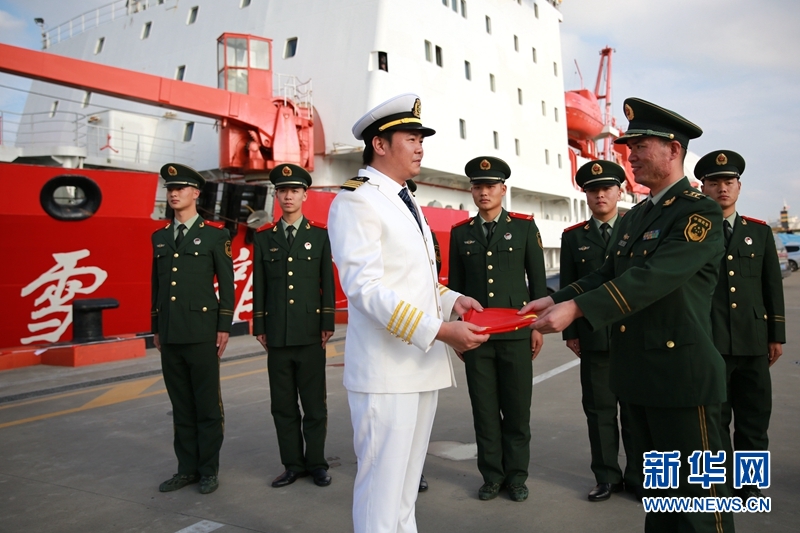 6日,上海边防总队上海边防支队官兵代表在中国极地科考码头,踏上了即将出征南极的”雪龙号“极地科考船,向第32次南极科考队赠国旗送行。