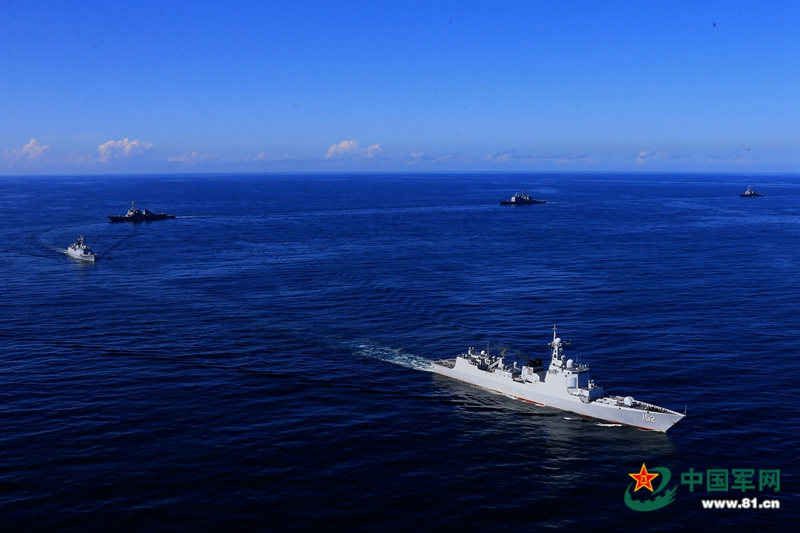 编队济南舰、益阳舰与美方参演三舰正在进行鱼贯法转向。 代宗锋 摄