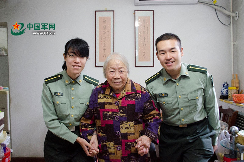 田翠云奶奶热情地拉着国防生同学的手。