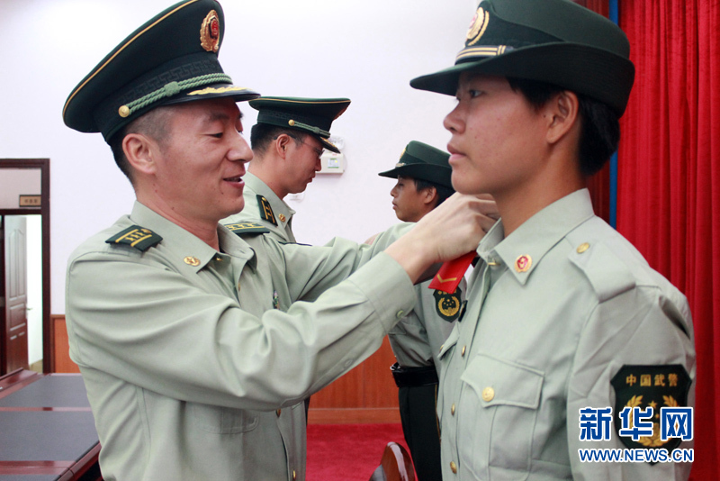 新兵代表吴欢激动地说:“戴上警衔,不仅感受到了一种光荣,更意味着承担着一份责任。在今后的工作中,我们将认真践行当代革命军人核心价值观,不断提高自身素质,做党和人民的忠诚卫士。”(林靖锋 李雪影)