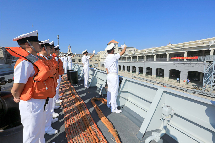 中国海军济南舰上的官兵向前来欢迎的人员挥手致意。记者曾涛 摄
