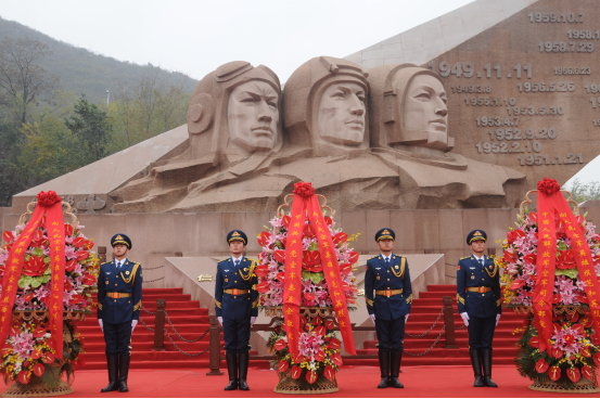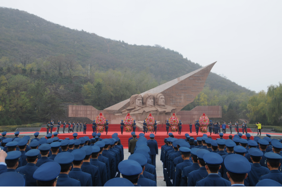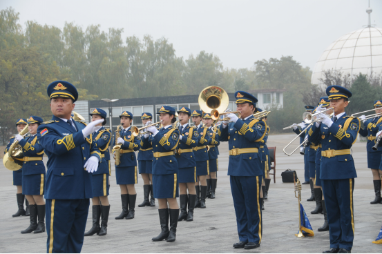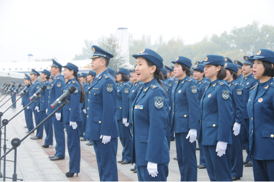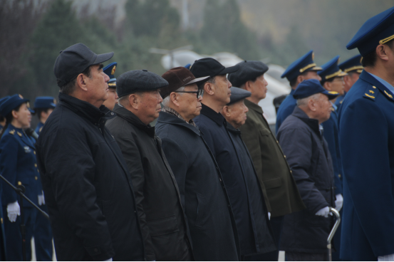 在庄严雄壮的《义勇军进行曲》旋律中,全体人员齐唱国歌。国歌唱毕,全场肃穆,向为人民空军建设发展作出卓著功绩的英雄模范敬礼,向为人民空军建设事业英勇献身的英烈们默哀。