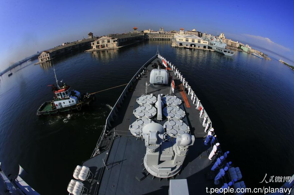当地时间11月10日上午,执行环球访问任务的海军152舰艇编队抵达哈瓦那港,开始对古巴进行为期5天的友好访问。期间,编队指挥员将拜会古军地高层,编队将举行舰艇开放、甲板招待会,慰问当地特殊学校。中古海军将举行反恐经验交流、体育比赛、文体交流等活动。(来源:中国海军发布)