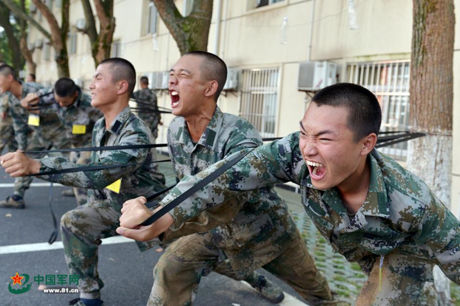 解放军新兵训练杀气四射 狂吼拉树挥板砖