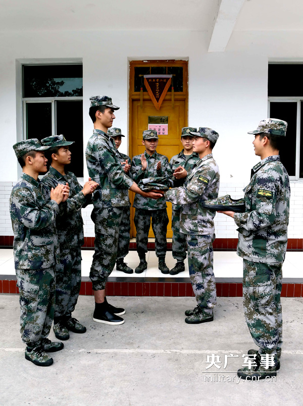 机关干部给新兵“小姚明”送军服和特制鞋
