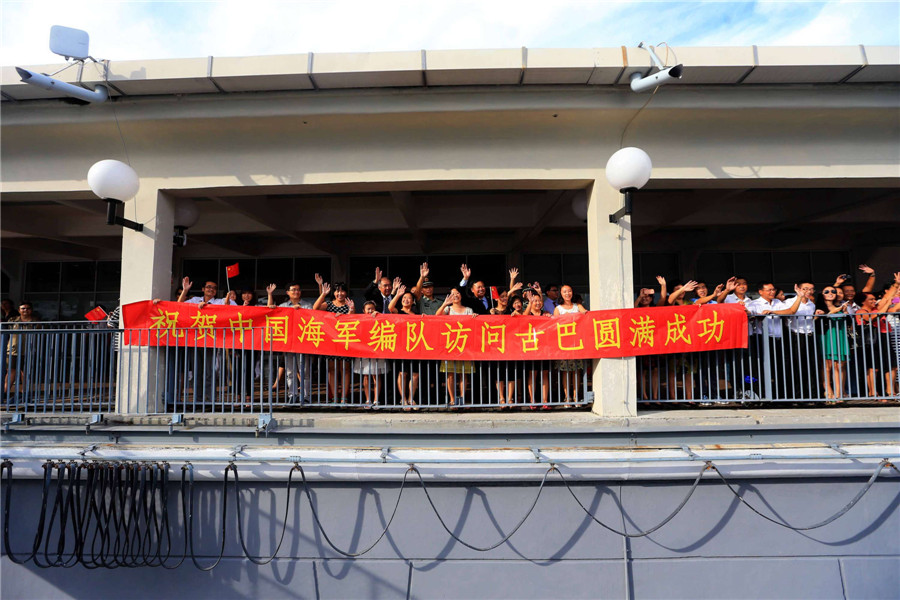 码头送行的人员向官兵挥手道别。代宗锋 摄