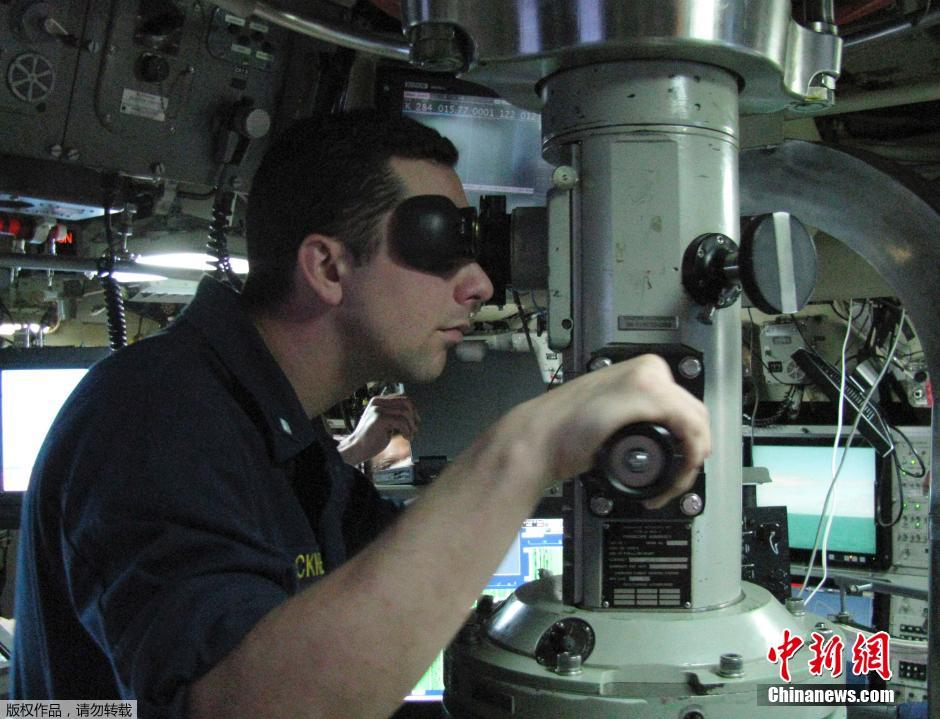 俄亥俄级核潜艇是美国海军1976年开始建造的一个核动力潜艇等级。该艇长170米,宽13米,潜航排水量18750吨,潜航深度240米;潜艇主要武器为潜射弹道导弹垂直发射系统24管(使用三叉戟C-4/D-5洲际导弹或98-154枚战斧巡航导弹),MK-67 21英寸(533mm)鱼雷管4管(使用MK-48线导鱼雷)。图为2008年2月3日之前,美国海军军官用“俄亥俄”号核潜艇的潜望镜观测水面。