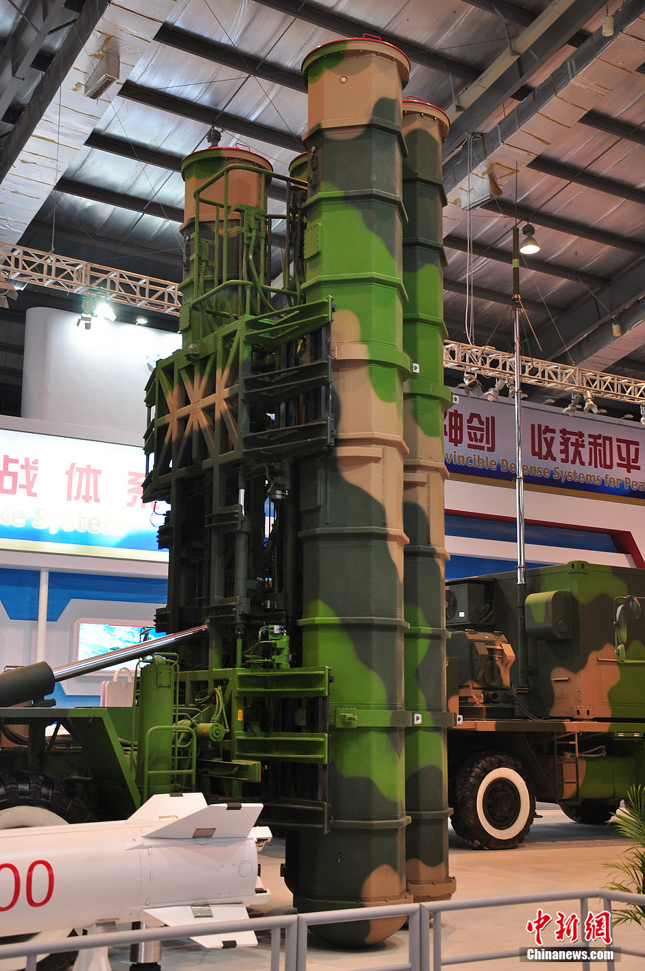 图为在珠海航展上亮相的红旗-9外销型FD-2000防空导弹系统。红旗-9地空导弹系统以营为基本作战单位,配备有一辆搜索雷达车,一辆跟踪、制导雷达车、一辆指挥控制车和6辆四联装导弹发射车,以及其他一些辅助车辆。