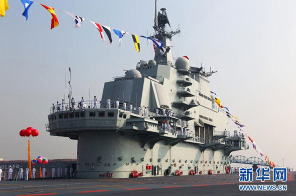 2012年9月25日,辽宁舰悬挂满旗,舰员精神抖擞分区列队。新华社记者 查春明 摄