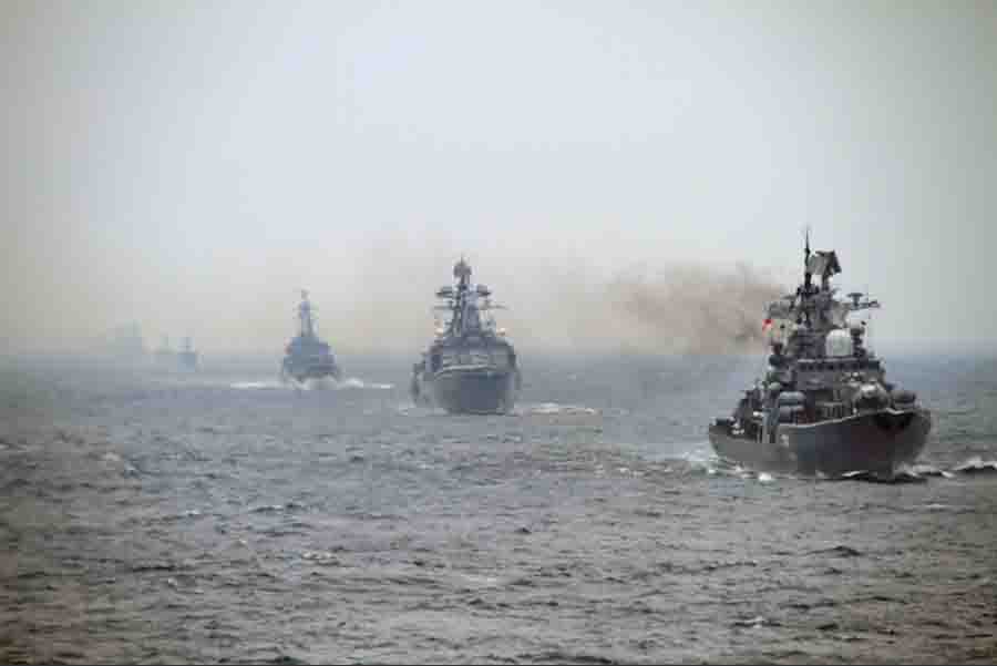 “海上联合—2015(Ⅱ)”军事演习结束后,中俄海军参演舰艇在彼得大帝湾举行了海上阅兵。中俄两国共12艘受阅舰艇排成单纵队,在检阅舰“瓦良格”号导弹巡洋舰右舷依次驶过。新华社记者孙彦新 摄