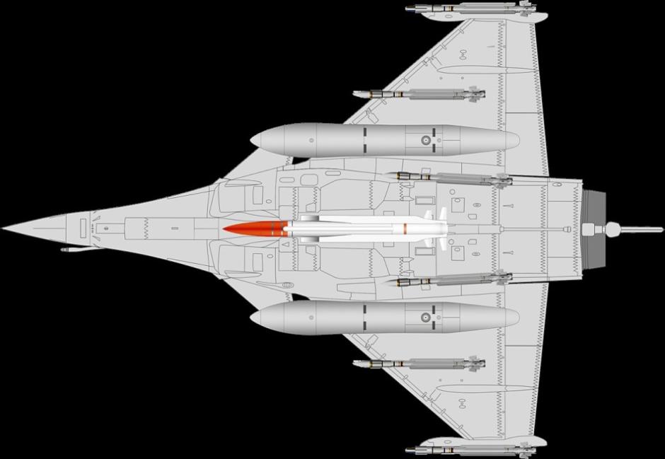 “阵风”战机核打击任务武器挂载模式:2具2000升副油箱、1枚ASMP-A核巡航导弹、4枚“米卡”-EM和2枚“米卡”-IR空空导弹。