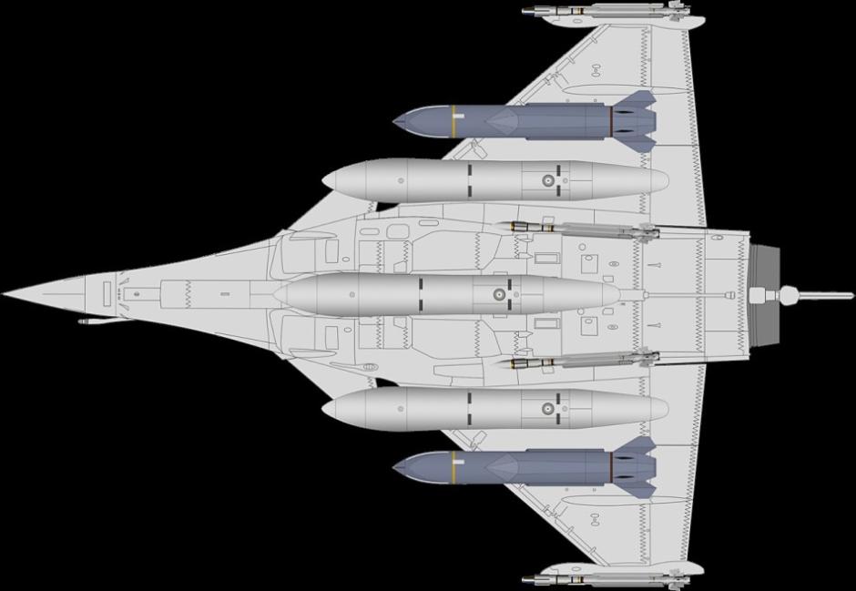 “阵风”战机远程攻击任务武器挂载模式:3具2000升副油箱、2枚“风影阴影”巡航导弹、4枚“米卡”-EM/IR空空导弹。