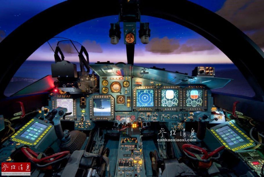图为苏-34战斗轰炸机的训练座舱,与苏-24的座舱布局相同,左侧为飞行员,右侧为轰炸领航员,但航电设备比苏-24先进许多,有多个大型彩色多功能显示器。