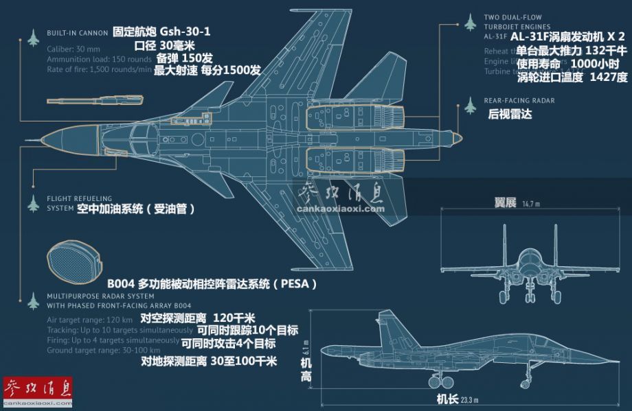 作为苏-24M战斗轰炸机的继任机型,苏-34配备了包括B004型多功能被动相控阵雷达(X波段,特别强调了对地探测能力,拥有超高精度的SAR(合成孔径)成像分辨力)和N012后视雷达(主要为导弹提供制导与告警)在内的多种先进电子设备,具备较强的全天候对地攻击能力。