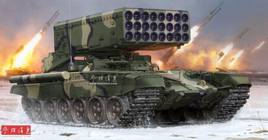 TOS-1“博罗季诺”(Buratino,绰号取自历史上著名的博罗季诺战役)自行多管火箭炮,俄军更习惯称其为“重型喷火坦克”,由T-72坦克底盘改装而来,主要用于面积压制敌方据点或杀伤集群目标。图为TOS-1A模型封绘。