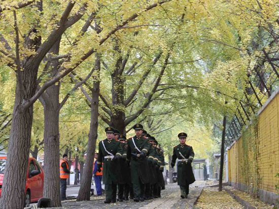 每年的这个季节,三里屯使馆区周边的银杏树叶尽透金黄,担负使馆区执勤任务的武警北京总队十七支队官兵就驻守在这里。郑光傲 摄