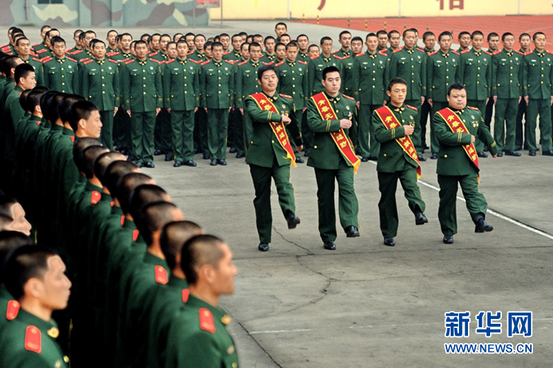 4名基层优秀士兵在训练场为新战士们做示范动作