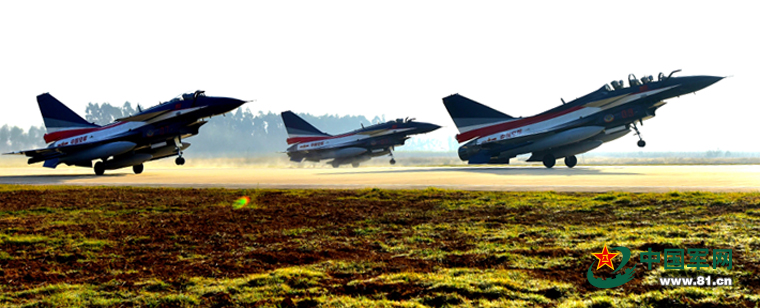中国空军八一飞行表演队于22日离境飞赴泰国,参加中泰空军联合训练闭幕式飞行表演。图为3架歼-10表演机编队起飞。 徐边春 摄