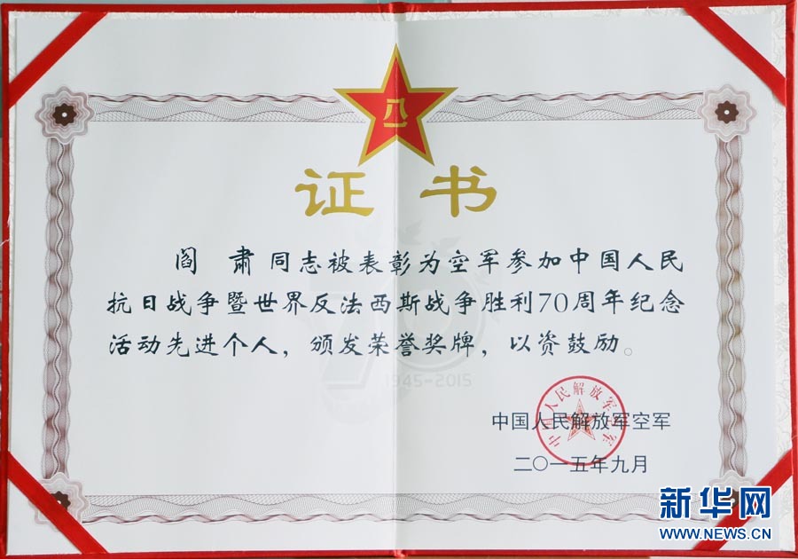 月,阎肃同志被表彰为空军参加中国人民抗日战争暨世界反法西斯战争胜利