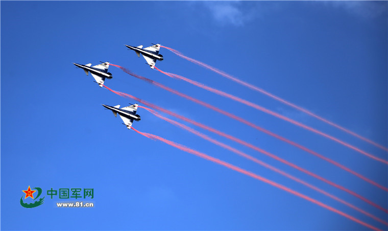 在21分钟的时间里,3架歼-10表演机展示了单机蛇形扭转、双机剪刀机动对头交叉、水平向上开花等19个特技飞行动作,按预定计划完成检验性飞行。