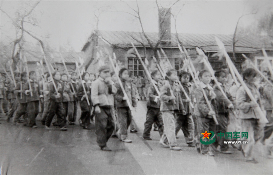 上世纪六十年代,孙吴县人武部组织驻地中小学生肩扛红缨枪进行军事训练。