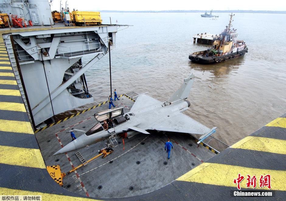 位于舰身左舷的跑道长195m(完成修改后),与舰身轴心有8.5度的夹角,其上装有两具美制C-13蒸汽弹射器,以轮流运作的方式让舰载机弹射升空;右舷舰岛后方处设有两具升降机,飞行甲板尾端则有三组降落拦阻索以及一组在紧急时使用的拦截网,以及全自动航空母舰降落系统、光学辅助降落系统和DALAS激光辅助降落系统,能让以超过275公里/小时的速度降落的舰载机在75米内顺利停止。两具弹射器交互使用时,该舰的飞行甲板每30秒可让一架飞机起飞,并在12分钟内让20架飞机降落。图为2006年4月2日,法国“戴高乐”号航母参加联合军演,战机乘电梯从机库中升上跑道。