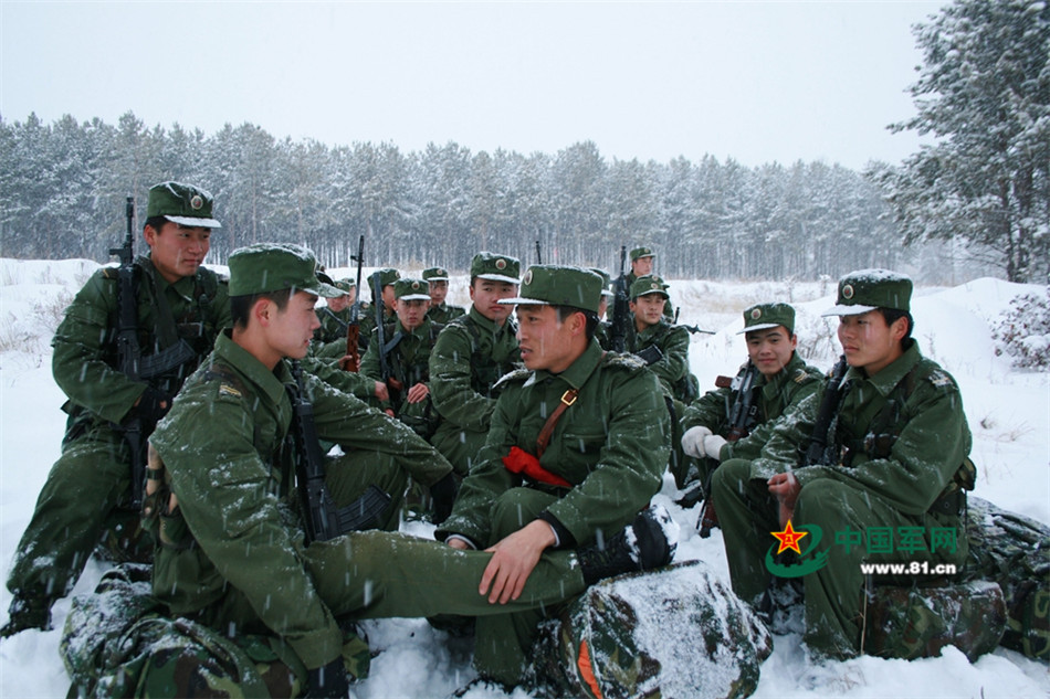 2007年10月27日,由孙吴县人武部选送的孙吴籍战士冒着严寒在大雪纷飞的林海雪原进行长途拉练,图为拉练途中休息。