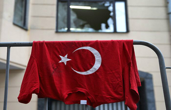 据俄罗斯国际文传电讯社报道,25日俄罗斯民众在土耳其驻俄使馆外就土耳其方面击落俄苏-24战机举行抗议活动。示威者向土耳其使馆投掷石块,鸡蛋,西红柿和油漆,并焚烧土耳其国旗。俄民众投掷的石头击中使馆二、三楼层的玻璃,落入使馆办公室内。