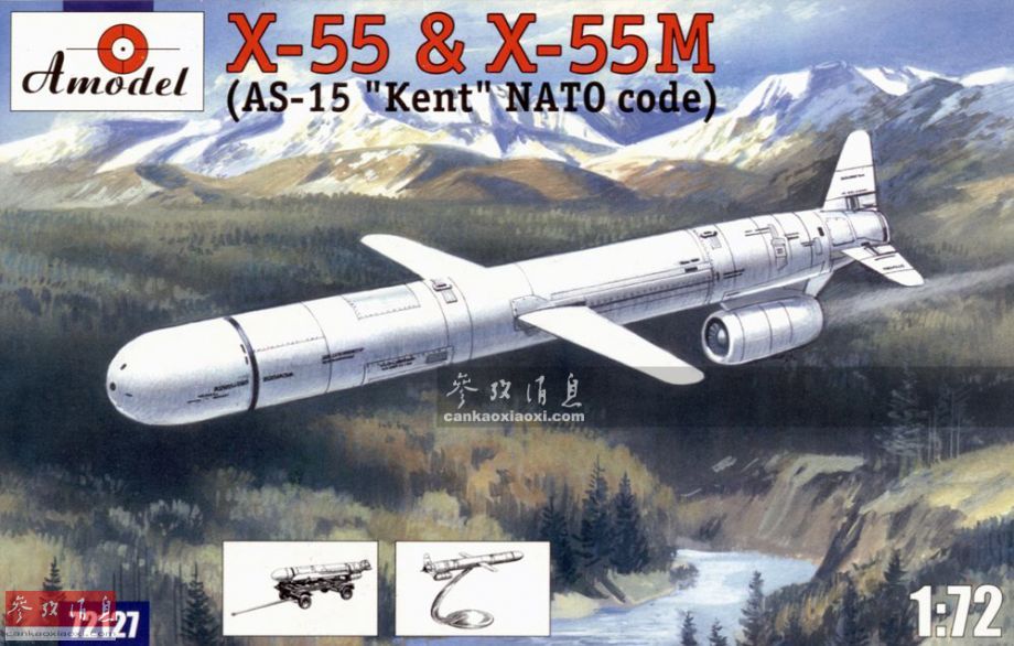 Kh-55系列是目前俄空军空基巡航导弹的主力,北约代号AS-15“肯特”,由于外形酷似美军“战斧”巡航导弹,又被称为战斧斯基。其早期型于1983年服役,最大飞行速度0.78马赫,此次使用的Kh-555是该系列的最新型号,于2000年服役,最大射程约3000千米,采用卫星制导方式,可携带450千克高爆弹头。图为Kh-55巡航导弹的模型封绘图。