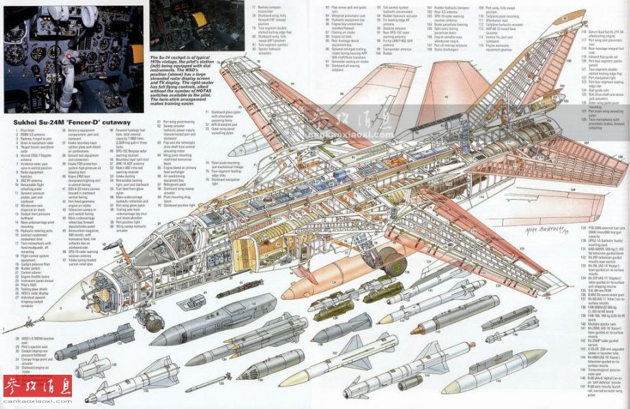 苏-24M全机长22.53米,最大翼展17.64米,最小翼展10.37米,机高6.19米,最大起飞重量43吨,最大平飞速度1.35马赫。最大作战半径615千米。图为苏-24M战斗轰炸机的彩色剖面图。