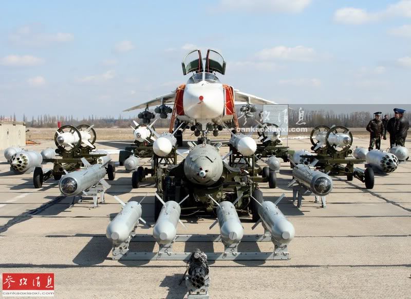 苏-24M机身翼下共8个外挂点,最大载弹量为8吨。图为苏-24M进行地面武器展示,最前方的为Gsh-6-23六管23毫米加特林航炮,是该型机的固定武装。后方从非制导航弹、精确制导航弹、空地导弹到重型燃料空气炸弹均为苏-24M可挂载的弹药。从挂配武器也能看出苏-24更侧重对地攻击性能,而非对空作战。