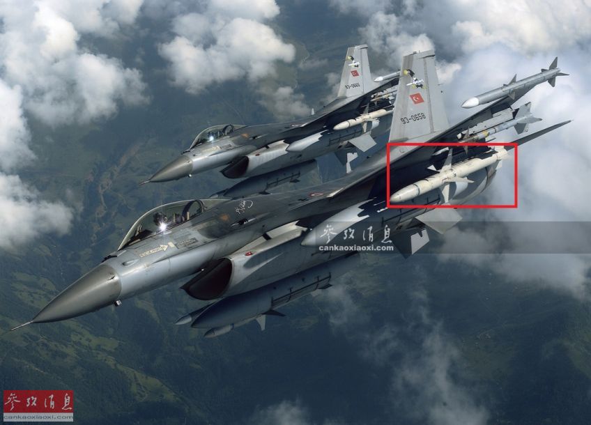 图为土耳其空军F-16C战斗机编队飞行,除了挂载AIM-120中距导弹和AIM-9格斗弹外,还挂载了AGM-88”哈姆“反辐射导弹(红框处),这种最大飞行速度可达3马赫的导弹对部署在叙土边境的俄军地面雷达具有较大威胁。