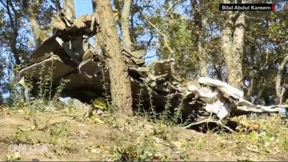 11月24日,俄罗斯空军的一架苏-24战机在土耳其和叙利亚边境地区被土耳其空军击落,随后在叙利亚一侧坠毁。25日,美国有线电视新闻网公布了一段坠毁战机残骸的最新画面。画面显示,这架苏-24战机机身已完全解体。一些大块的残骸落在了树丛里。在周围的地面上,也可以看到四处散落的碎片。这说明战机在坠毁的过程中受到了严重冲击。